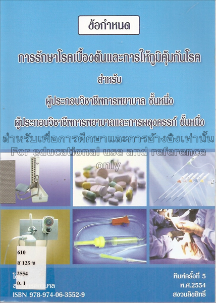 ข้อกำหนดการรักษาโรคเบื้องต้นและการให้ภูมิคุ้มกันโรค : สำหรับผู้ประกอบวิชาชีพการพยาบาลชั้นหนึ่ง ผู้ประกอบวิชาชีพการพยาบาลและการผดุงครรภ์ ชั้นหนึ่ง / โดย สภาการพยาบาล